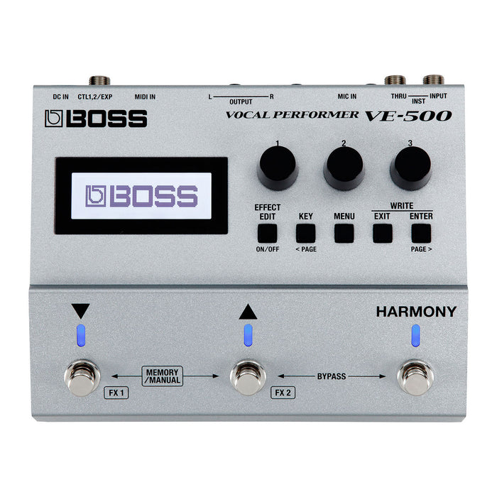 Packing professional sound quality and serious BOSS DSP muscle, the VE-500 delivers sophisticated harmony and pitch correction functions that automatically track the chords you play on your guitar. It also includes a powerful vocoder and core sound-enhancement tools, plus world-class reverb, delay, and modulation sounds and specialty effects like distortion, filtering, and many others. And with programmable memories, you can instantly recall favorite setups for any song or style. The VE-500 is the perfect addition to the pedalboard of any singing guitarist, providing top-flight vocal processing that fits right alongside your standard guitar effects.