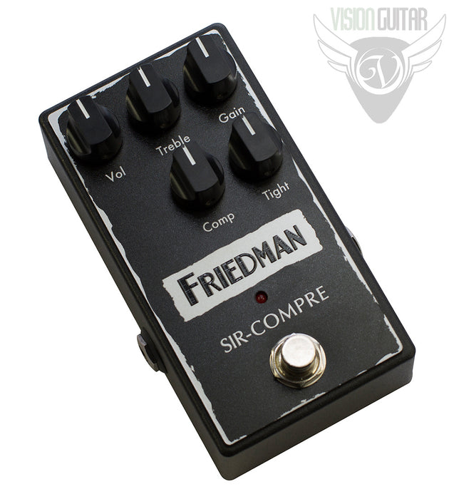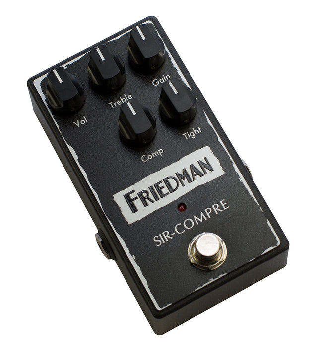 The Sir-Compre is an optical compressor pedal with a Friedman twist. The compressor controls include volume, treble, compression and a tight knob. The twist is the included wide-range gain knob. This gain control is the mastermind of the Sir-Compre and allows you to shape the overall sound of the pedal from ultra-clean to semi-overdriven. This combination of compression and overdrive delivers epic tone versatility - semi gritty compression, warm compressed overdrive, singing compressed drive, or adding that special channel to your clean amp - it's all here with the Sir-Compre. And the twist is in the same itself!