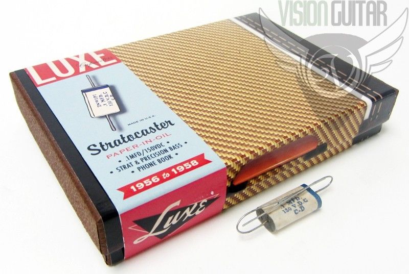 Completely redesigned, new and improved tone! Handmade, foil/paper/wax capacitors, faithful to vintage specs, as used in the late 1950s in the Telecaster and Stratocaster. Bulk caps are individually wrapped and boxed. Kit versions come complete with detailed wiring diagrams, misc. extras and deluxe tweed case-style box with obi strip. Also available in a Vision Guitar pre-wired kit.